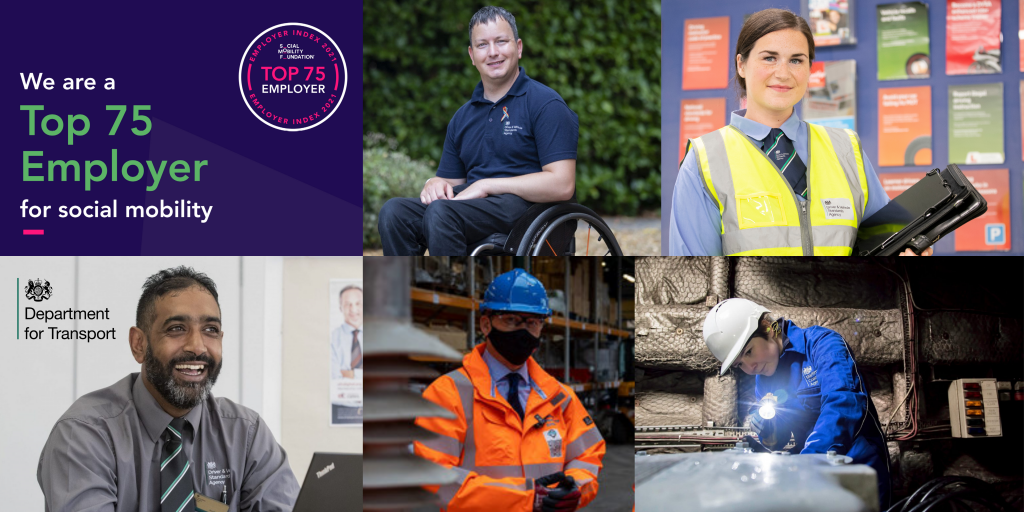 We’re delighted to announce that The Department for Transport was recently awarded the 29th position in the Top 75 Employers for Social Mobility across the UK in 2021. We’re proud to be recognised as a Leader in social mobility by The Social Mobility Employer Index, an organisation which compares the chances that a child from a disadvantaged background will do well at school and get a good job in England, and analyses how well employers hire diverse talent across this criteria.